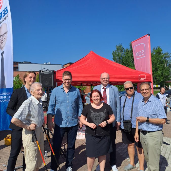 Kiertueella mukana olivat myös eurovaaliehdokkaat Eero Heinäluoma (128) ja Sari Helin (130) sekä kansanedustajat Lauri Lyly, Ilmari Nurminen ja Pia Viitanen.
