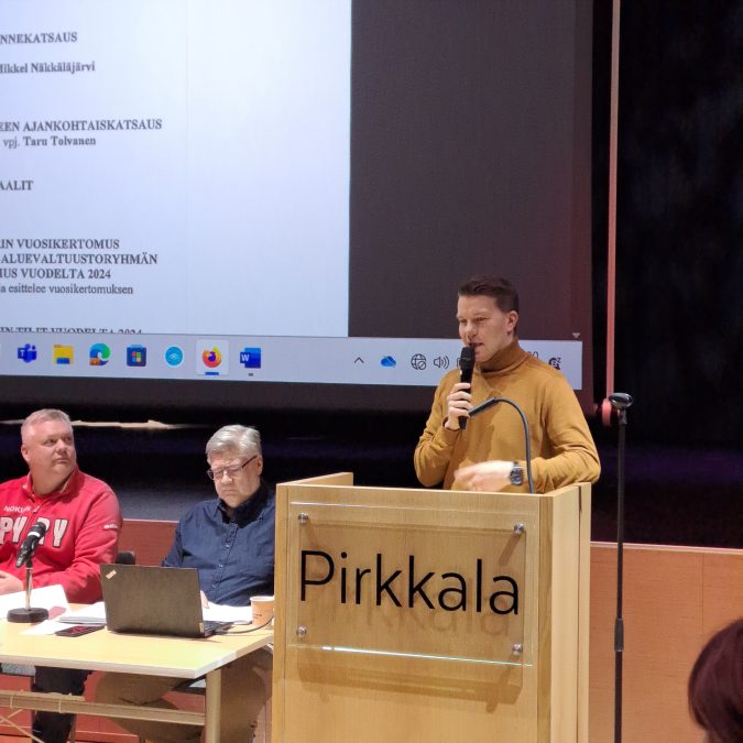 Kevätpiirikokousta vietettiin Pirkkalassa uudehkon Verso-rakennuksen Pirkkala-salissa lauantaina 22. maaliskuuta. Kokouksen puheenjohtajina toimivat piirin puheenjohtaja Roope Lehto ja pormestariehdokas Taru Tolvanen Pirkkalasta.