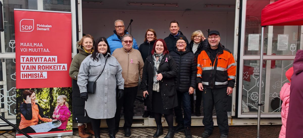Taru Tolvasen pormestariehdokkuus julkaistiin lauantaina 9.11. Pirkkalassa Suupantorilla. Kuvassa Taru ja tukijoukkoa.